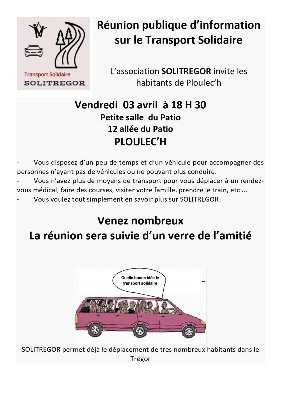 L’association SOLITREGOR vous invite à une réunion d’information sur le transport solidaire : 📅 Vendredi 3 avril 🕡 À 18h30 📍 Petite salle du Patio – 12 allée du Patio, Ploulec’h